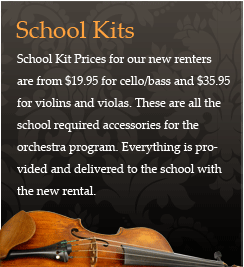 | We bill either in 3 months or 12 month increments. In other words, you will pay for 3 or 12 months at a time. With the 12 month option, you only pay for 10 months and GET TWO MONTHS FREE! The rental contract is not a rent-to-own contract, however, you will be accruing rental credit that can be used toward the purchase of the rental instrument or any other instrument we have in stock. If you reserve an instrument now, we will charge your credit card at this time. The rental term will not start until 9/01/15. The instrument and accessories will be delivered before the beginning of school. Maintenance, included in the rental price, covers the replacement of broken strings, bridges and bows, and most minor damage to the instrument. Major damage will result in a fee. Complete details of the maintenance are included in the contract. We offer delivery to most school districts in the area for instruments reserved at least a week prior to the start of the school year. Once you have filled out more information about your rental, we will provide you with details on the qualification of your rental for delivery. We also offer a "School Kit" for purchase. This kit includes the method book used by the school, a music stand, rosin, a Kun shoulder rest for violins and violas or a rock stop for cellos and basses. |